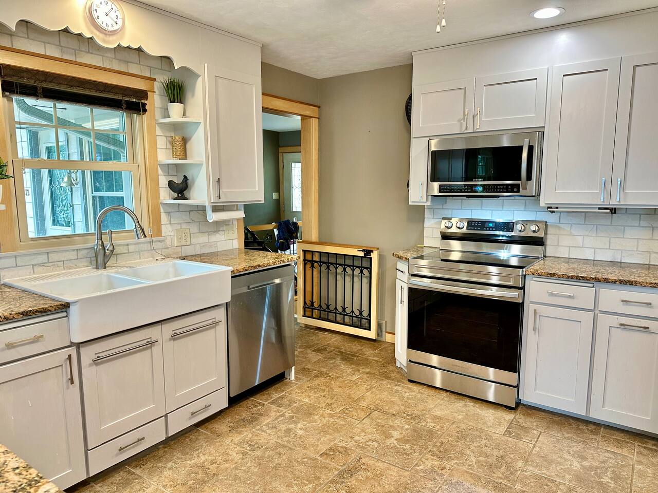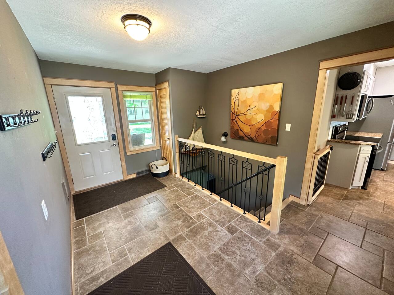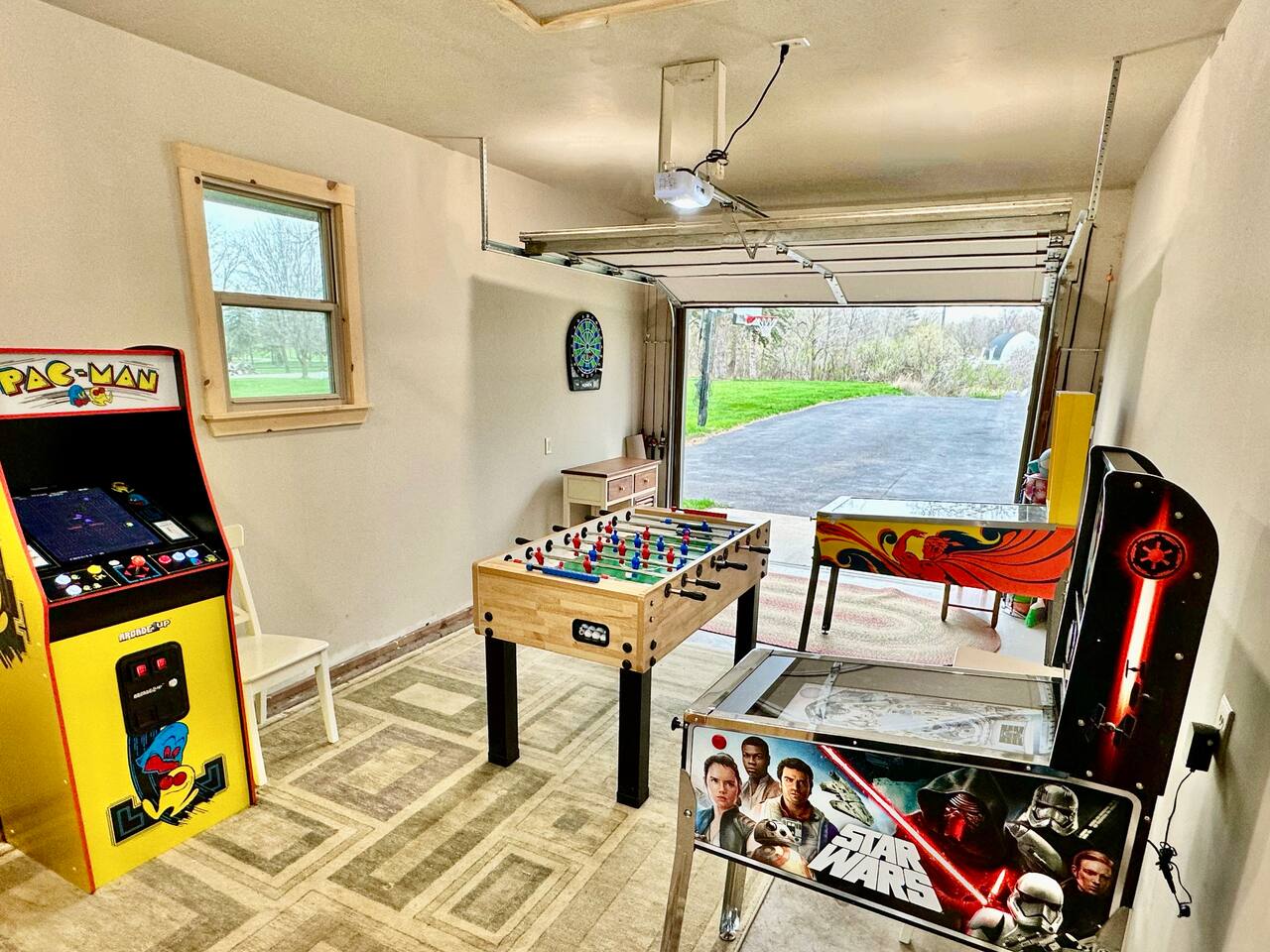 Notes: - The dock and swimming platform are seasonal. - The lake is down two flights of stairs. - Outdoor security cameras are present. - There are farms near the property. - COLD MONTH STAYS: 1) Lake Access: allowed with prior arrangements. The stairs need to be cleared of ice and snow. 2) Game room is moved to the basement - the garage is too cold in the winter!!