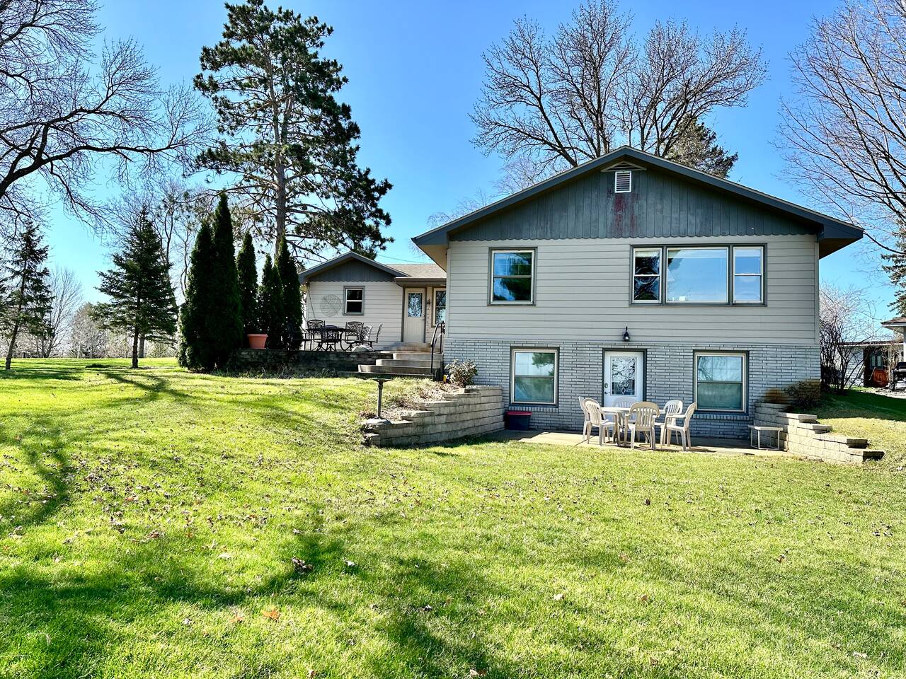 Designed for both privacy and togetherness, this home comfortably accommodates up to 12 guests without feeling cramped. Five spacious bedrooms provide personal retreats, while the absence of TVs in the bedrooms encourages quality time with family and friends. Thoughtfully designed gathering spaces ensure everyone can spread out. Indoors, two separate living rooms (each with large TVs) and a game room provide plenty of space to relax. Outdoors, distinct areas allow groups to enjoy different activities without being on top of one another. The game room opens to the front yard with a basketball hoop, while the backyard features two separate patios, a fire pit set in a spacious lawn. Whether you're unwinding solo or making memories together, there's a perfect spot for everyone. OUTDOOR FUN The paver fire pit offers stunning lake views year-round, while the game room—complete with foosball, darts, and arcade games—keeps the excitement going. A variety of yard games add even more entertainment options. SUMMER LAKE LIFE Enjoy water activities and fishing on Lake Wapogasset. During the summer months, the dock accommodates one boat (tie-up) and includes a floating lounge/swim platform for soaking up the sun. WINTER CHILL Cold-weather adventures await with downhill skiing and tubing at Trollhaugen (10 minute drive), access to Polk County ATV/UTV & Snowmobile Trails (about 1 mile from the home), and ice fishing on Wapogasset and Bear Trap Lakes. INDOOR COMFORT With five bedrooms across two floors, everyone has space to unwind. The main level features three bedrooms, including a bunk room, while the lower level has two more bedrooms. Each floor has its own family room and bathroom. The main floor also includes a gas fireplace, a dining area for 12, and a well-equipped kitchen. Downstairs, you'll find a dedicated card/game area, a cozy chess nook, and a laundry room. FAMILY-FRIENDLY AMENITIES The bunk room is stocked with toys and books for kids of all ages. For little ones, safety and convenience are top priorities. The home includes a built-in baby gate, plastic plates and cups, child-friendly utensils, a bottle warmer and drying rack, a white noise machine, step stools in the bathrooms, a baby monitor, a Pack ‘n Play, a highchair, and a junior chair. EXPLORE NEARBY: Plenty of activities in the area for all ages. Notes: - The dock and swimming platform are seasonal. - The lake is down two flights of stairs. - Outdoor security cameras are present. - There are farms near the property. - COLD MONTH STAYS: 1) Lake Access: allowed with prior arrangements. The stairs need to be cleared of ice and snow. 2) Game room is moved to the basement - the garage is too cold in the winter!! I have a fairly strict cancellation policy. While I do stick to it, I am open to rescheduling your trip for comparable valued dates.